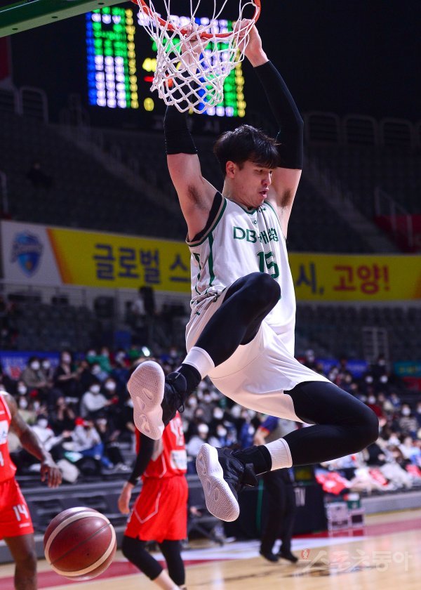 21일 경기도 고양체육관에서 열린 ‘2021-2022 프로농구’ 오리온과 DB 경기에서 DB 김종규가 덩크슛을 성공시키고 있다.