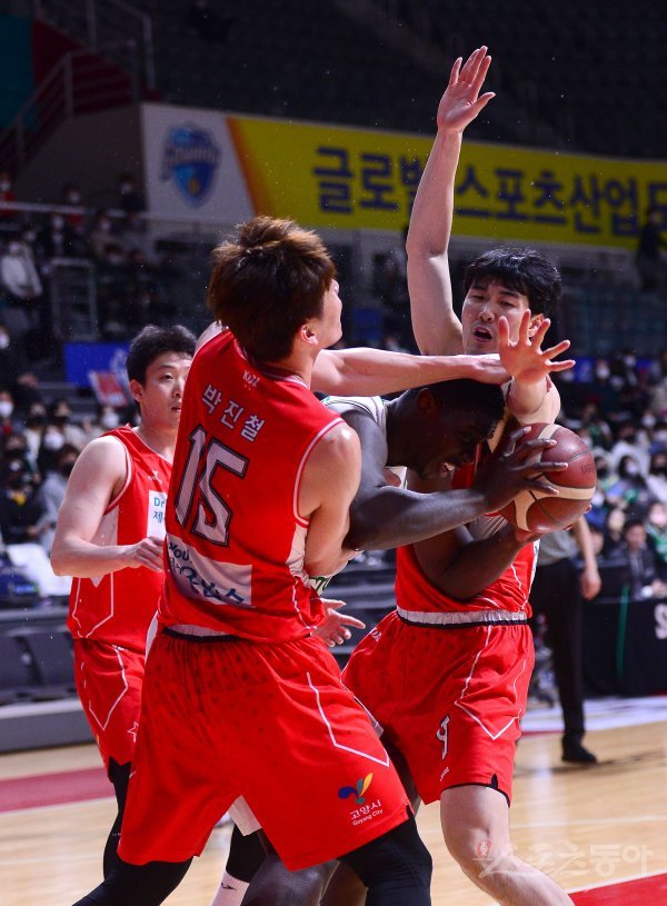 21일 경기도 고양체육관에서 열린 ‘2021-2022 프로농구’ 오리온과 DB 경기에서 DB 조니 오브라이언트가 오리온 박진철과 이정제의 드블 수비에 막혀 고전하고 있다.