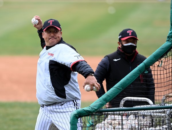 21일 인천 SSG 랜더스필드에서 ‘2022 KBO리그’ SSG 랜더스와 LG 트윈스의 시범경기가 열린다. 경기 전 LG 조인성 코치가 배팅볼 투수로 나서 볼을 던지고 있다.