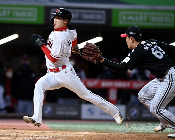21일 인천 SSG 랜더스필드에서 ‘2022 KBO리그’ SSG 랜더스와 LG 트윈스의 시범경기가 열렸다. 4회말 무사 만루에서 폭투 때 SSG 3루주자 최지훈이 LG 최용하의 태그를 피해 홈으로 달리고 있다.