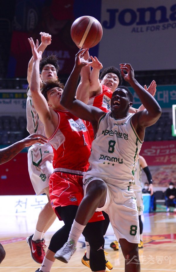 21일 경기도 고양체육관에서 열린 ‘2021-2022 프로농구’ 오리온과 DB 경기에서 DB 조니 오브라언트, 이준희와 오리온 박친철, 김강선이 리바운드 볼을 다투고 있다.