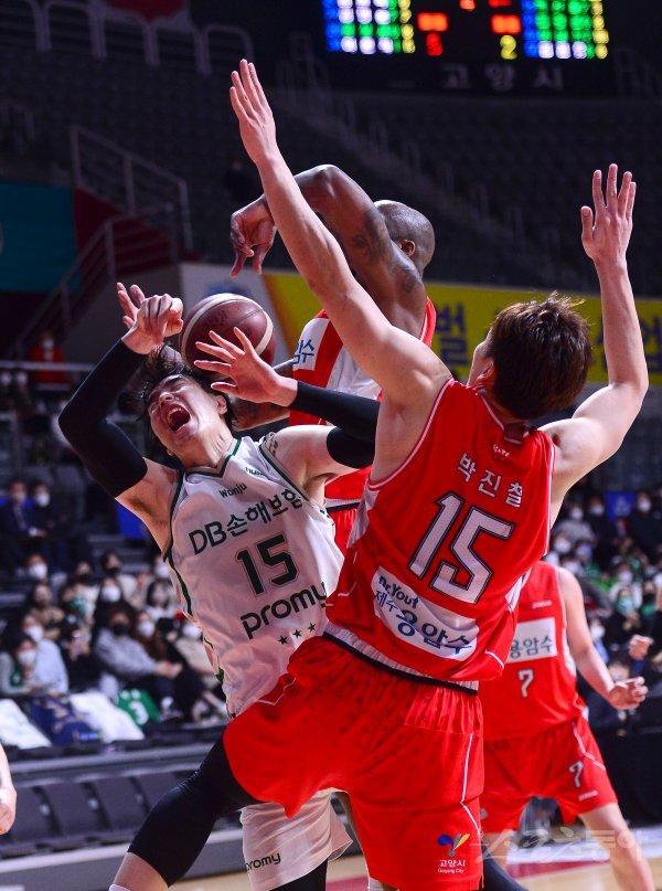 21일 경기도 고양체육관에서 열린 ‘2021-2022 프로농구’ 오리온과 DB 경기에서 DB 김종규가 오리온의 수비에 막혀 볼을 놓치고 있다.