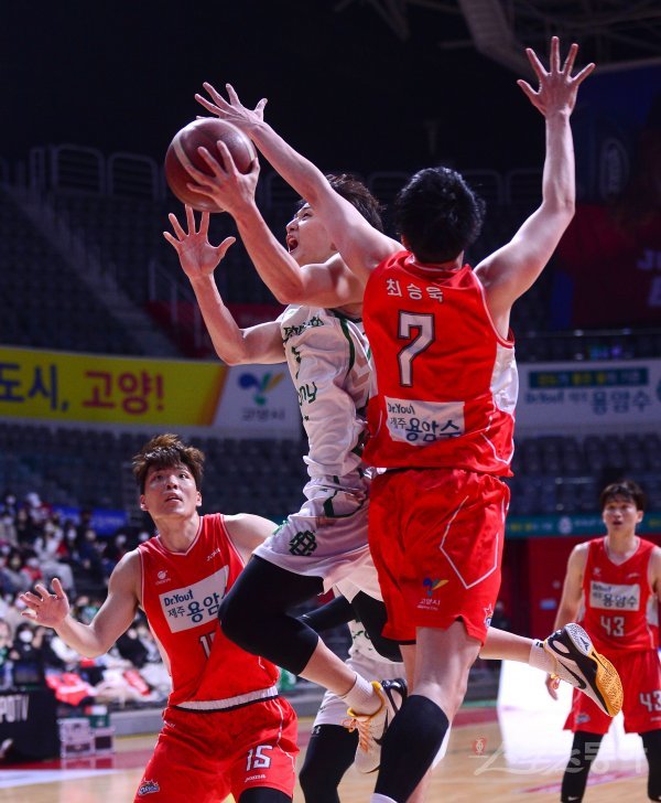 21일 경기도 고양체육관에서 열린 ‘2021-2022 프로농구’ 오리온과 DB 경기에서 DB 허웅이 오리온의 수비를 뚫고 골밑 슛을 하고 있다. 고양 | 김종원 기자 won@donga.com