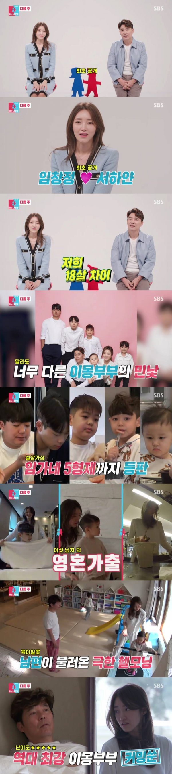 이어 5형제가 한 명씩 등장했고, 서하얀은 아이들의 식사는 물론 등교 및 등원 준비까지 하느라 정신없는 아침을 보냈다. 반면 임창정은 침대에서 휴대폰을 보며 느긋했다. 임창정은 아이의 등원 준비를 도와달라는 요청에도 서투른 모습을 보여 서하얀을 답답하게 했다. 막내의 양치질을 제대로 시키지 못하는가 하면 아이의 얼굴에 로션을 발라주려는 아내를 향해 “얘 세수 안 했는데? 세수해야 해?”라고 한 것. 결국 서하얀의 표정은 순식간에 굳고 말았는데.