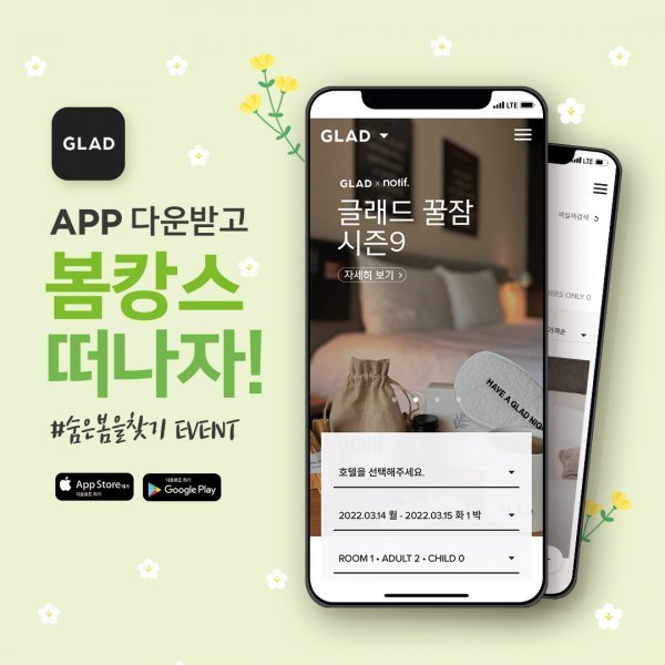 앱 출시 기념으로 ‘앱(APP) 다운받고 봄캉스 떠나자!’ 이벤트를 31일까지 진행한다. 체크인 시 프론트 직원에게 앱 설치와 회원가입, 앱 푸시 설정을 인증하면 소정의 선물을 제공한다. 이벤트 기간 내 봄날의 호캉스 패키지 3종(컬러풀 스프링, 글래드와 봄, 글래드 꿀잠 시즌9 패키지) 예약 시 패키지 할인을 제공한다.
