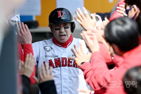 22일 인천 SSG 랜더스필드에서 ‘2022 KBO리그’ SSG 랜더스와 LG 트윈스의 시범경기가 열렸다. 4회말 무사에서 SSG 김강민이 솔로 홈런을 쏘아 올린 후 동료들의 환영을 받고 있다.