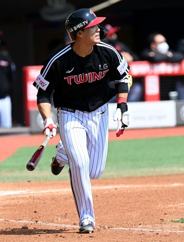 22일 인천 SSG 랜더스필드에서 ‘2022 KBO리그’ SSG 랜더스와 LG 트윈스의 시범경기가 열렸다. 2회초 2사에서 LG 송찬의가 솔로 홈런을 쏘아 올린 후 타구를 바라보고 있다.
