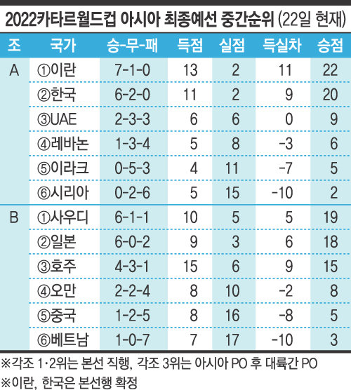 2022카타르월드컵 아시아 최종예선 B조에선 아직 본선 진출국이 나오지 않고 있다. 사우디아라비아, 일본, 호주가 1~3위로 본선 직행을 다투고 있는 가운데 9차전을 앞둔 분위기는 각기 달라 눈길을 끈다.
