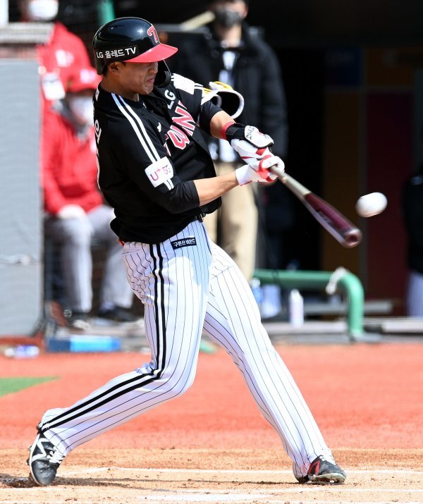 22일 인천 SSG 랜더스필드에서 ‘2022 KBO리그’ SSG 랜더스와 LG 트윈스의 시범경기가 열렸다. 2회초 2사에서 LG 송찬의가 솔로 홈런을 쏘아 올리고 있다.