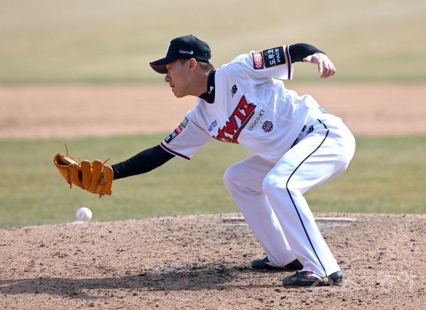 22일 수원KT위즈파크에서 ‘2022 신한은행 MY CAR KBO리그’ 한화 이글스와 KT 위즈의 시범 경기가 열렸다. 7회초 무사 KT 이창재가 타구를 놓치고 있다.