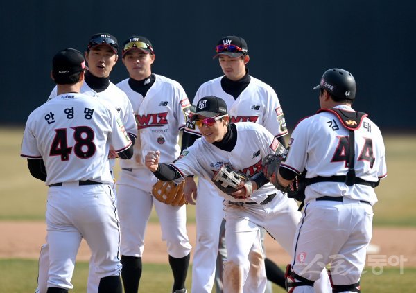 22일 수원KT위즈파크에서 ‘2022 신한은행 MY CAR KBO리그’ 한화 이글스와 KT 위즈의 시범 경기가 열렸다. 6-4 승리를 거둔 KT 선수들이 하이파이브 하고 있다.