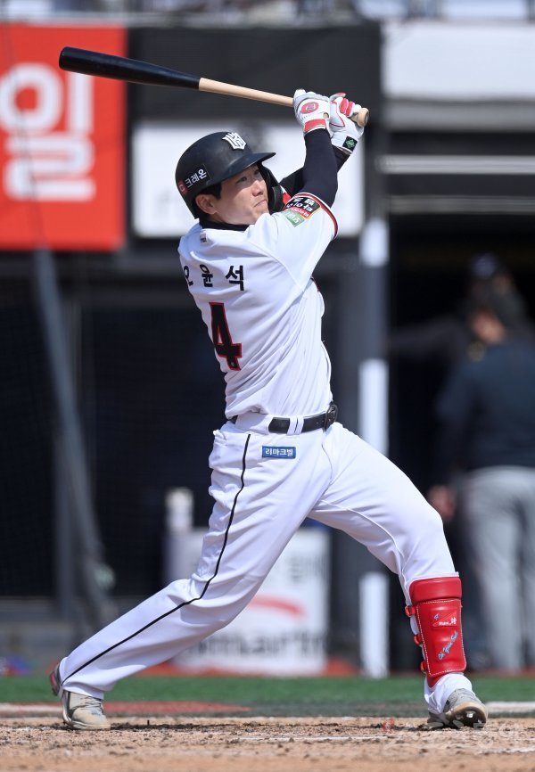 22일 수원KT위즈파크에서 ‘2022 신한은행 MY CAR KBO리그’ 한화 이글스와 KT 위즈의 시범 경기가 열렸다. 5회말 무사 KT 오윤석이 우전 2루타를 치고 있다.