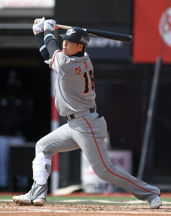 22일 수원KT위즈파크에서 ‘2022 신한은행 MY CAR KBO리그’ 한화 이글스와 KT 위즈의 시범 경기가 열렸다. 2회초 무사 2,3루 한화 하주석이 동점을 만드는 2타점 좌전 2루타를 치고 있다.