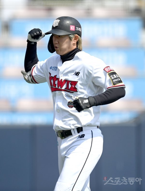 22일 수원KT위즈파크에서 ‘2022 신한은행 MY CAR KBO리그’ 한화 이글스와 KT 위즈의 시범 경기가 열렸다. 1회말 무사 KT 김민혁이 우월 솔로 홈런을 날린 후 그라운드를 돌아 홈인하고 있다.