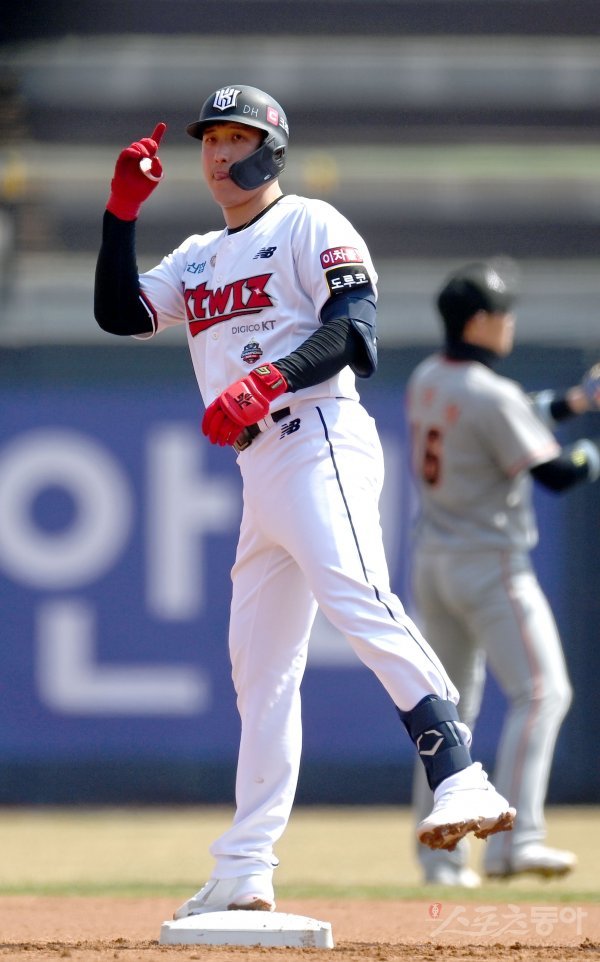 22일 수원KT위즈파크에서 ‘2022 신한은행 MY CAR KBO리그’ 한화 이글스와 KT 위즈의 시범 경기가 열렸다. 1회말 무사 KT 황재균이 중전 2루타를 치고 2루에서 기뻐하고 있다.