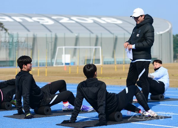 올림픽축구대표팀(U-23)이 22일 강원도 강릉종합운동장 보조경기장에서 소집훈련을 하고 있다. 황선홍 감독이 회복조 선수들과 이야기를 하고 있다.