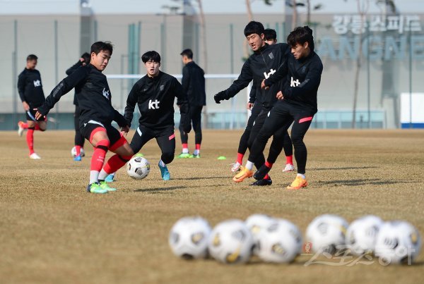 올림픽축구대표팀(U-23) 선수들이 22일 강원도 강릉종합운동장 보조경기장에서 소집되어 패스 훈련을 하고 있다.