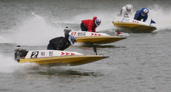 턴 마크에서 몽키턴 기술을 펼치며 경합을 벌이고 있는 경정 선수들. 사진제공|국민체육진흥공단