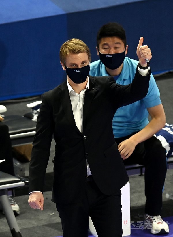 22일 인천 계양체육관에서 ‘2021-2022 도드람 V리그’ 인천 대한항공과 의정부 KB손해보험의 남자부 경기가 열렸다. 대한항공 토미 틸리카이넨 감독이 선수들의 플레이에 환호하고 있다.