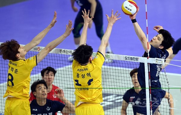 22일 인천 계양체육관에서 ‘2021-2022 도드람 V리그’ 인천 대한항공과 의정부 KB손해보험의 남자부 경기가 열렸다. 대한항공 정지석이 KB손해보험 블로커를 피해 공격을 펼치고 있다.