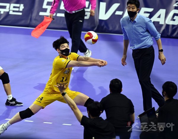 22일 인천 계양체육관에서 ‘2021-2022 도드람 V리그’ 인천 대한항공과 의정부 KB손해보험의 남자부 경기가 열렸다. KB손해보험 홍상혁이 수비를 펼치고 있다.
