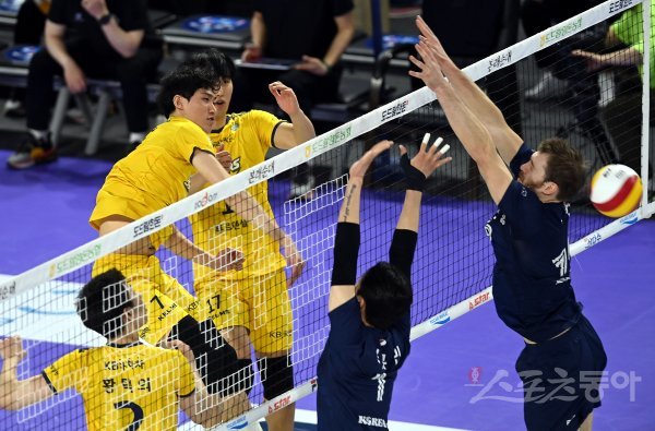 22일 인천 계양체육관에서 ‘2021-2022 도드람 V리그’ 인천 대한항공과 의정부 KB손해보험의 남자부 경기가 열렸다. KB손해보험 박진우가 대한항공 블로커를 피해 공격을 펼치고 있다.