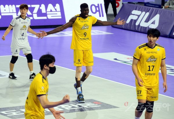 22일 인천 계양체육관에서 ‘2021-2022 도드람 V리그’ 인천 대한항공과 의정부 KB손해보험의 남자부 경기가 열렸다. KB손해보험 선수들이 4세트를 승리한 뒤 환호하고 있다.