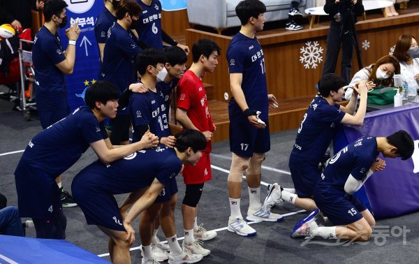 22일 인천 계양체육관에서 ‘2021-2022 도드람 V리그’ 인천 대한항공과 의정부 KB손해보험의 남자부 경기가 열렸다. 대한항공 선수들이 웜업존에서 승리를 기원하고 있다.