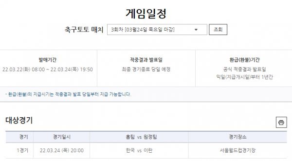 국민체육진흥공단에서 발행하는 체육진흥투표권 스포츠토토의 수탁사업자 스포츠토토코리아가 24일(목) 오후 8시 서울월드컵경기장에서 열리는 2022카타르월드컵 아시아 최종예선 조별리그 A조 9차전 대한민국(홈)-이란(원정)전을 대상으로 축구토토 매치 3회차 게임을 발매한다.전반 및 최종 스코어 맞히기…24일(목) 오후 7시50분 발매 마감