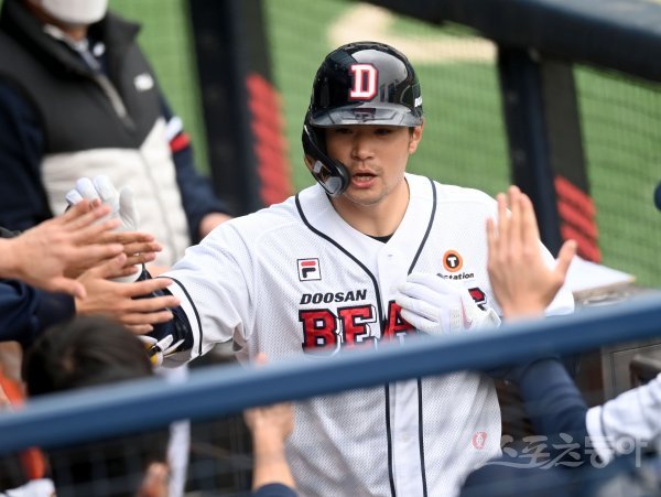 24일 서울 잠실야구장에서 ‘2022 신한은행 MY CAR KBO리그’ LG 트윈스와 두산 베어스의 시범 경기가 열렸다. 6회말 1사 두산 김재환이 동점을 만드는 우월 솔로 홈런을 날린 후 그라운드를 돌아 홈인해 하이파이브 하고 있다.