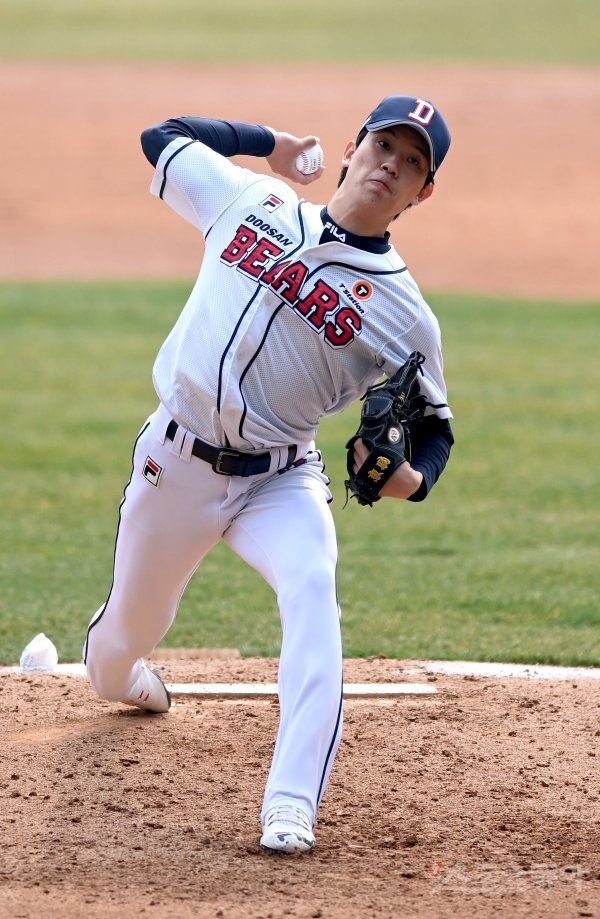 24일 서울 잠실야구장에서 ‘2022 신한은행 MY CAR KBO리그’ LG 트윈스와 두산 베어스의 시범 경기가 열렸다. 교체 등판한 두산 박신지가 역투하고 있다.