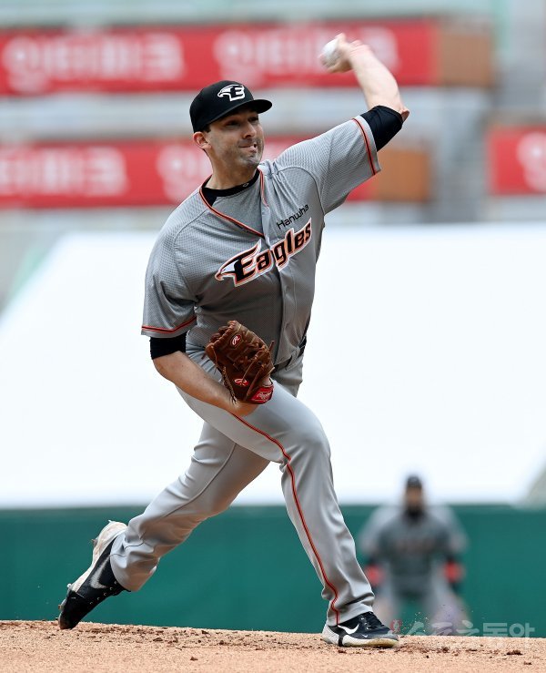 24일 인천 SSG 랜더스필드에서 ‘2022 KBO리그’ SSG 랜더스와 한화 이글스의 시범경기가 열렸다. 한화 선발투수 카펜터가 힘차게 볼을 던지고 있다.