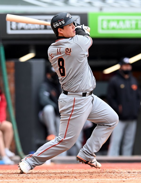 24일 인천 SSG 랜더스필드에서 ‘2022 KBO리그’ SSG 랜더스와 한화 이글스의 시범경기가 열렸다. 7회초 2사 1, 3루에서 한화 노시환이 1타점 역전 적시타를 날리고 있다.