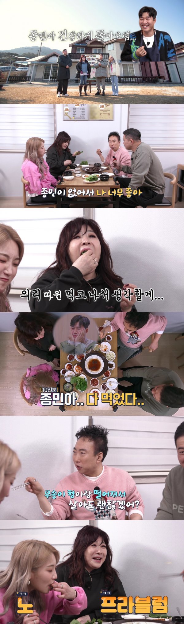 박명수는 갈비 맛에 흠뻑 취해 "김종민이 없어서 너무 좋다. 종민이가 먹을 양까지 더 먹을 수 있어서"라고 고백한다. 노사연 또한 "종민아 미안하다. 음식 앞에서는 의리도 없다"며 먹방에 열중한다.