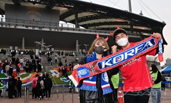 24일 서울월드컵경기장에서 열린 ‘2022 카타르 월드컵’ 아시아 최종예선 9차전 한국과 이란의 경기에 앞서 관중들이 기념 촬영을 하고 있다.