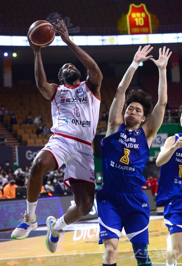 24일 잠실체육관에서 열린 ‘2021-2022 프로농구’ 삼성과 한국가스공사 경기에서 한국가스공사 디제이 화이트가 삼성의 수비를 뚫고 골밑 슛을 하고 있다.