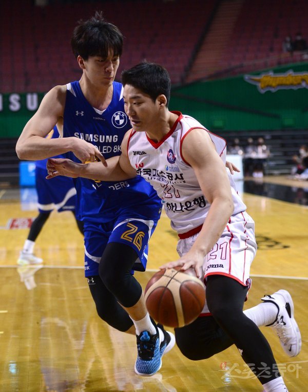 24일 잠실체육관에서 열린 ‘2021-2022 프로농구’ 삼성과 한국가스공사 경기에서 한국가스공사 이대헌이 삼성의 수비를 뚫고 골밑을 공격하고 있다.