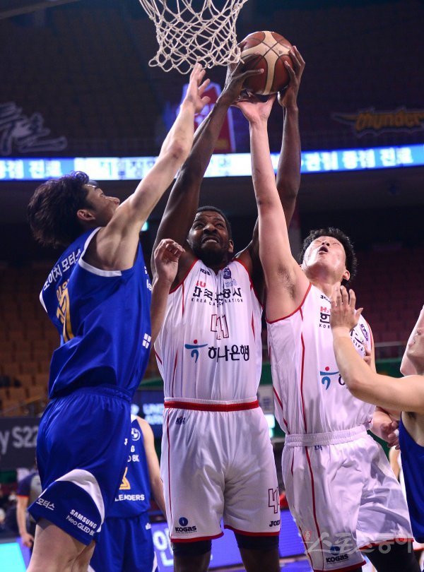 24일 잠실체육관에서 열린 ‘2021-2022 프로농구’ 삼성과 한국가스공사 경기에서 한국가스공사 앤드류 니콜슨이 리바운드 볼을 잡고 있다.