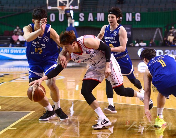 24일 잠실체육관에서 열린 ‘2021-2022 프로농구’ 삼성과 한국가스공사 경기에서 한국가스공사 두경민이 삼성의 수비를 뚫고 골밑을 공격하고 있다.