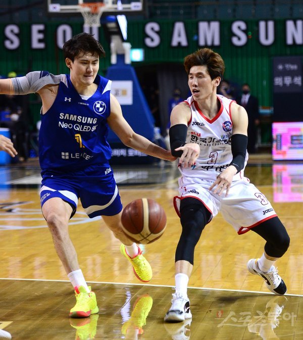 24일 잠실체육관에서 열린 ‘2021-2022 프로농구’ 삼성과 한국가스공사 경기에서 한국가스공사 두경민이 삼성 수비를 피해 패스를 하고 있다.