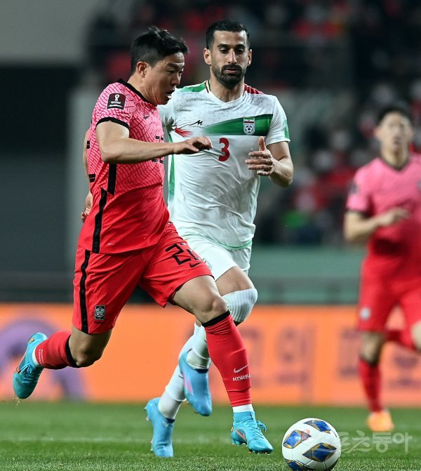 24일 서울 마포구 서울월드컵경기장에서 ‘2022 카타르월드컵’ 아시아 최종예선 한국과 이란의 경기에서 한국 권창훈이 이란 수비를 제치며 돌파하고 있다.