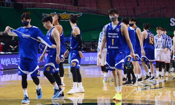24일 잠실체육관에서 열린 ‘2021-2022 프로농구’ 삼성과 한국가스공사 경기에서 67-90으로 패하며 9연패에 빠진 삼성 선수들이 코트를 빠져나가고 있다.