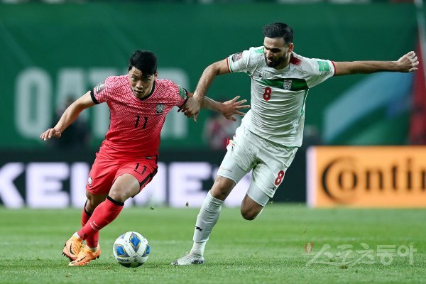 24일 서울 마포구 서울월드컵경기장에서 ‘2022 카타르월드컵’ 아시아 최종예선 한국과 이란의 경기에서 한국 황희찬이 이란 선수의 수비를 제치며 돌파하고 있다.