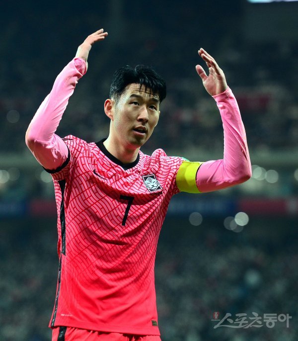 24일 서울 마포구 서울월드컵경기장에서 ‘2022 카타르월드컵’ 아시아 최종예선 한국과 이란의 경기에서 한국 손흥민이 팬들의 환호를 유도하고 있다.