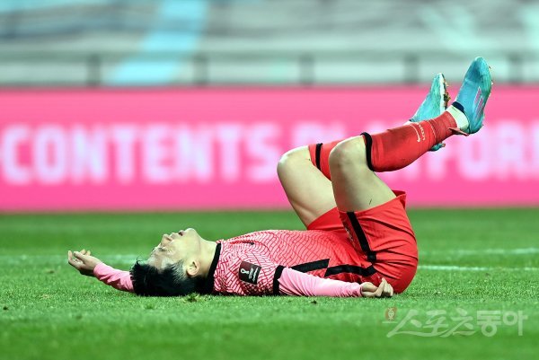 24일 서울 마포구 서울월드컵경기장에서 ‘2022 카타르월드컵’ 아시아 최종예선 한국과 이란의 경기에서 한국 손흥민이 슛이 수비에 막히자 아쉬워하고 있다.