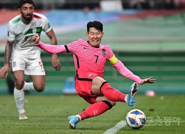 24일 서울월드컵경기장에서 열린 ‘2022 카타르 월드컵’ 아시아 최종예선 9차전 한국과 이란의 경기에서 한국 손흥민이 슛을 시도하고 있다. 상암 | 주현희 기자 teth1147@donga.com