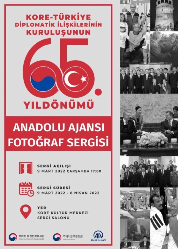 주터키한국문화원(이하 문화원)는 한·터 수교 65주년을 기념해 아나돌루 통신사가 보유한 한국과 터키의 관계를 상징하는 사진을 9일부터 4월8일까지 문화원 4층 전시실에서 전시한다.주터키한국문화원과 아나돌루 통신사가 협업하여 한국과 터키의 우정, 형제의 관계를 사진과 영상으로 소개했다. 6세기 무렵 말을 잘 타고 활을 잘 쏘는 고구려와 돌궐(투르크)이 처음으로 만났던 장면을 상상하며 그린 애니메이션과 함께 6.25 전쟁에 세계서 4번째로 많은 파병을 한 터키군인들의 활약과 전쟁영웅 타흐신 야즈즈 장군의 모습도 확인할 수 있다. 그리고 제1대 정일권 주터키한국대사의 6.25참전용사 격려 행사 장면도 전시되어 있다.