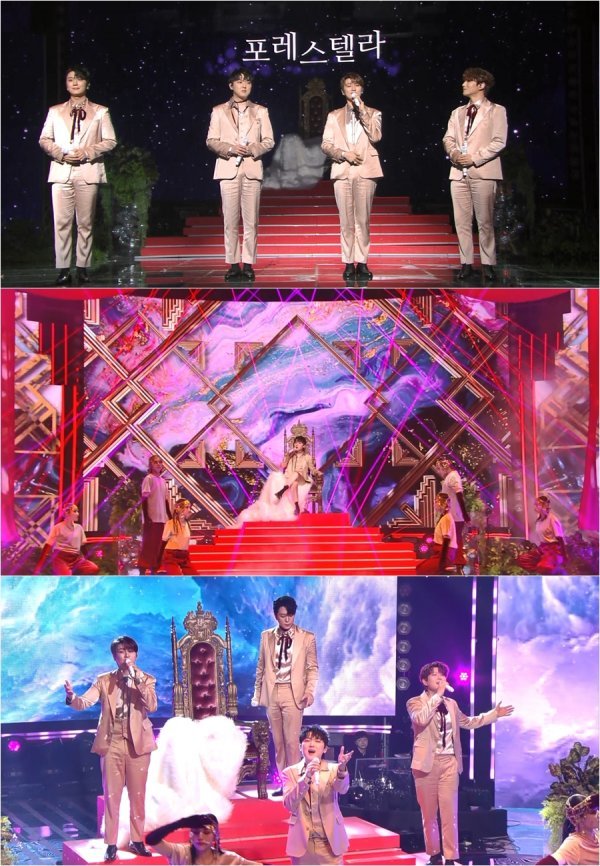 ‘불후의 명곡’ 아티스트 김창완 편 녹화일에 데뷔 4주년을 맞이한 포레스텔라는 또 하나의 레전드 무대를 탄생시키겠다는 각오로 무대에 올라 전매특허인 전율의 하모니와 시선을 사로잡는 퍼포먼스를 선보였다. 무엇보다 토목 공사라고 오해할 만큼 웅장한 무대 장치와 이국적인 느낌이 물씬나는 편곡, 곡의 분위기를 찰떡같이 표현한 안무 퍼포먼스, 황금을 두른듯한 스타일링 등 상상 이상의 스케일로 입을 다물 수 없게 만들었다. 포레스텔라의 무대를 본 잔나비 최정훈은 “기상천외하다”며 무한 감탄을 터트렸고, 김창완은 “시간여행을 하는 것처럼 황홀한 무대"며 극찬을 보냈다고.