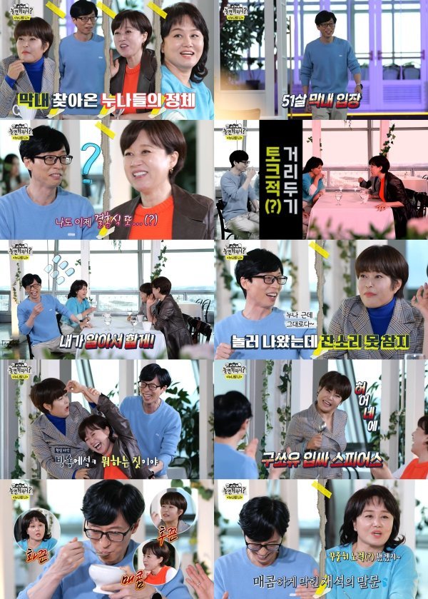 이어 누나들은 본격적으로 매운맛 토크 시동을 걸며, 유재석을 진땀 흘리게 했다. 조혜련은 “경실언니 두 번째 결혼식에 왔었냐”라고 물었고, 유재석은 “첫 번째 결혼식 때는 잘 몰라서 못 갔고, 두 번째는 갔다”라고 답해 폭소케 했다. 이에 박미선은 “재석아 기다려. 나도 이제 결혼식을 또”라며, 재혼(?)을 예고하는 너스레를 떨었다. 또 박미선은 “요새는 이혼해도 나갈 프로가 참 많더라. 살 만한 세상”이라고 말해 웃음을 유발했다.