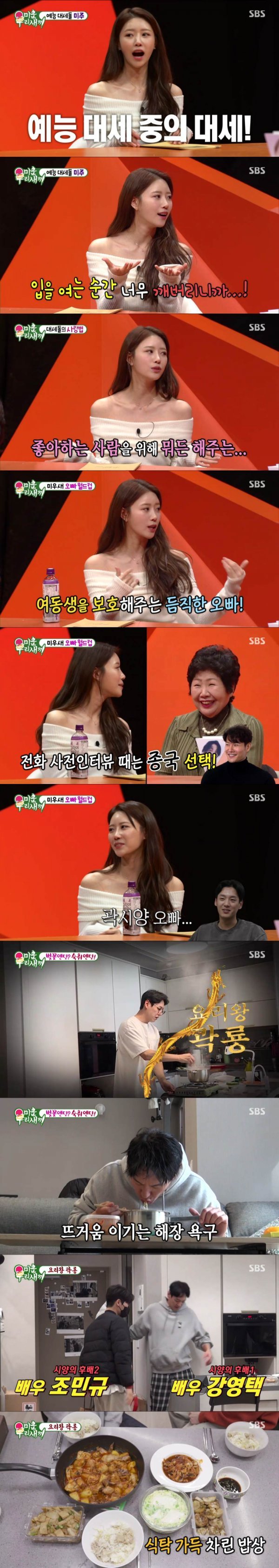 곽시양은 이날, 미주가 반할 정도로 뛰어난 요리 실력을 발휘해 시선을 집중시켰다. 전날 숙취로 힘들어하던 시양은 일어나자마자 닭가슴살 해장 라면으로 군침을 자극했다. 이어 ‘곽장금’답게 후배 배우인 조민규, 강영택을 위해 콩나물삼겹살밥과 닭볶음탕, 주꾸미볶음, 새송이버터조림, 순두부계란찜까지 순식간에 진수성찬을 차려 눈길을 끌었다.